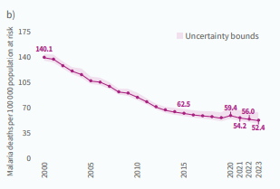 Le nombre total de décès dus au paludisme dans le monde s'est élevé à 597 000 en 2023 contre 578 000 en 2015. En 2020, les perturbations causées par la pandémie de COVID-19 ont entraîné une forte hausse des décès associés au paludisme, avec 55 000 morts supplémentaires. Le nombre total de décès a réduit progressivement durant les années postCOVID, tout comme le taux de mortalité.