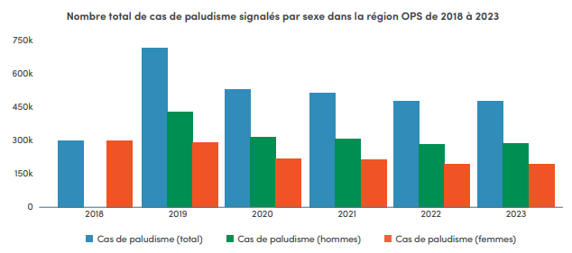 En effet, travailler dans certains secteurs comme l'agriculture, la foresterie, le service militaire et l'exploitation minière, supposent la plupart du temps des environnements propices à la transmission du paludisme, ce qui amplifie l'exposition à la maladie. Dans la région de l'Organisation panaméricaine de la santé (OPS), où l'extraction aurifère contribue largement à la transmission systématique du paludisme, les garçons et les hommes ont enregistré plus de cas de paludisme et de décès associés que les jeunes filles et les femmes entre 2018 et 2023. Voir l'infographie