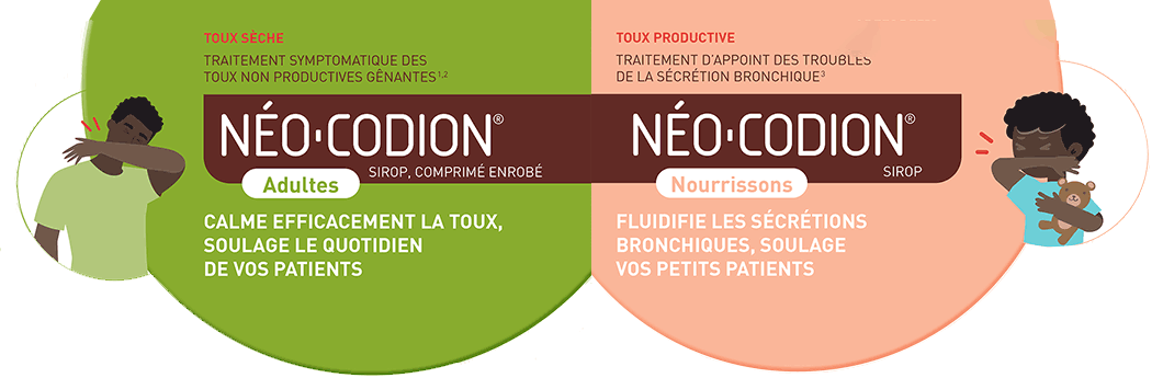 NEO-CODION NOURRISSONS, sirop est indiqué pour un usage pédiatrique. Il ne contient pas de codéine et peut être utilisé avec prudence chez la femme enceinte ou qui allaite, faute de données cliniques exploitables.