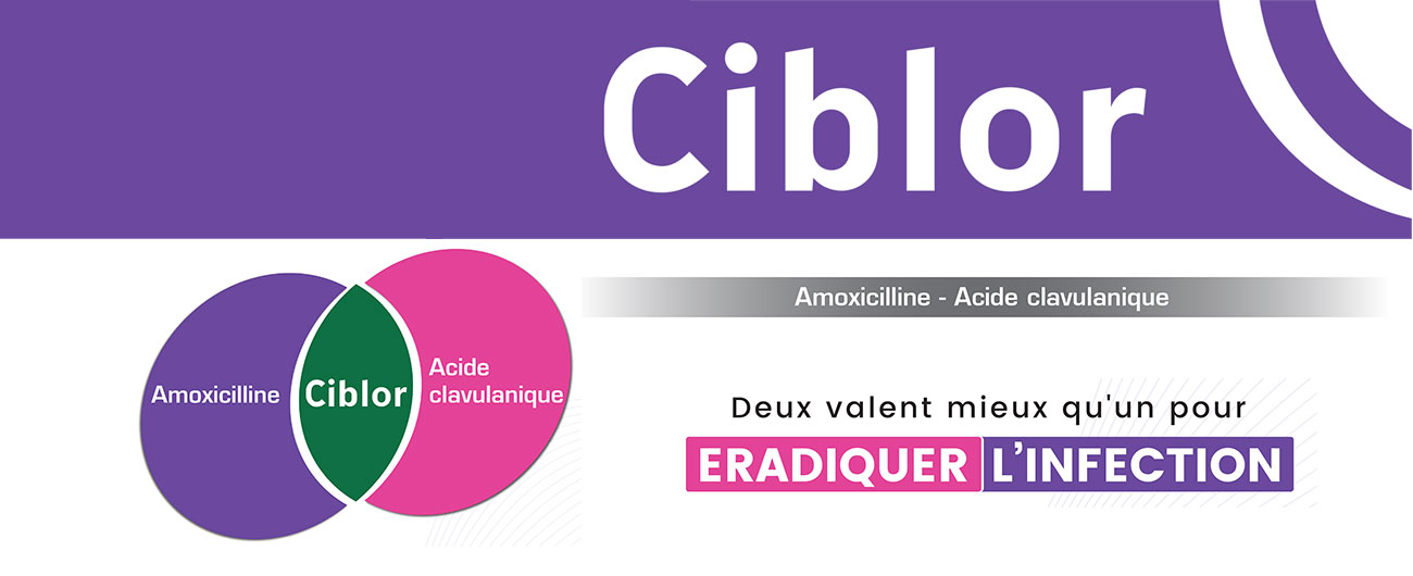 Les laboratoires Pierre Fabre ont le plaisir de vous informer de la mise sur le marché de Ciblor® (amoxicilline + acide clavulanique), un antibiotique de la famille des pénicillines à spectre élargi c'est-à-dire actives sur un plus grand nombre de germes que la pénicilline simple. L'adjonction d'acide clavulanique permet d'empêcher la destruction de l'amoxicilline par certaines bactéries. Code ATC : J01CR02.