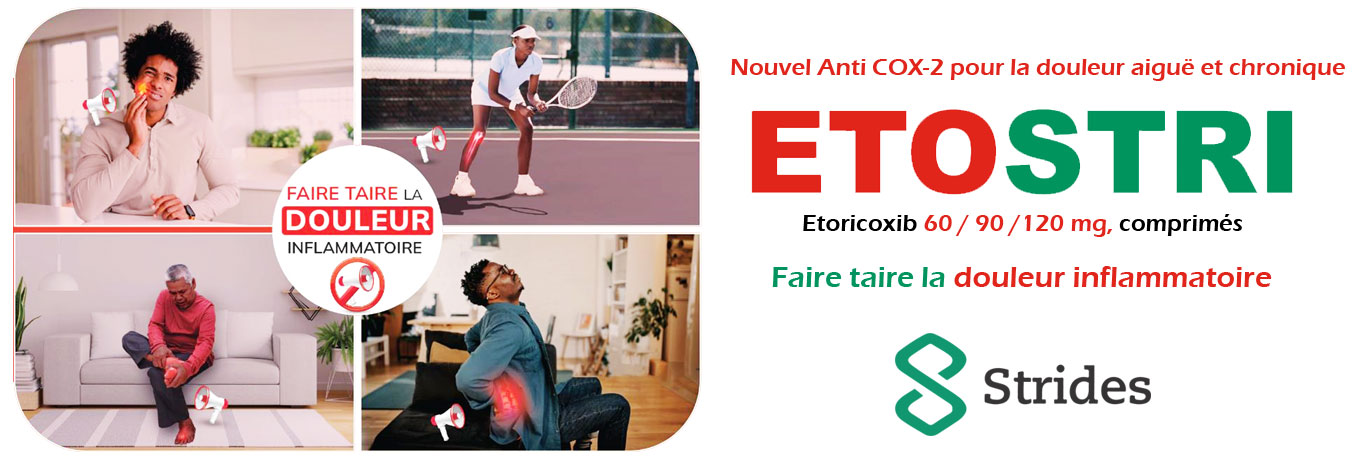 ETOSTRI® est indiqué chez les adultes et les adolescents âgés de 16 ans et plus pour le soulagement symptomatique de l'arthrose, de la polyarthrite rhumatoïde, de la spondylarthrite ankylosante et de la douleur et des signes d'inflammation associés à l'arthrite goutteuse aiguë.