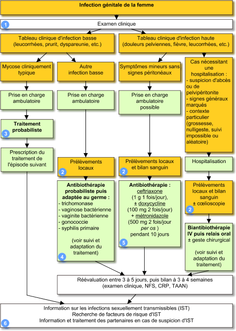 Dans les pays à revenu faible ou intermédiaire, on s'appuie sur l'identification de signes et symptômes cohérents et facilement reconnaissables pour orienter le traitement, sans recourir à des tests en laboratoire. Cette méthode, appelée prise en charge syndromique, se fonde souvent sur des algorithmes cliniques et permet aux agents de santé de diagnostiquer une infection spécifique sur la base des syndromes observés (par exemple, pertes vaginales, écoulements urétraux, ulcérations anogénitales, etc.).