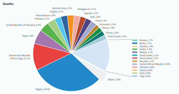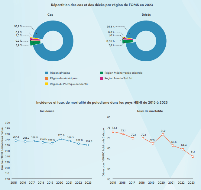 La région Afrique paye toujours le plus lourd tribut, cumulant à elle seule 94 % du nombre total des cas et 95 % des décès associés au paludisme au niveau mondial selon les estimations de 2023. Un peu plus de la moitié de ces décès ont été enregistrés dans quatre pays : Niger (5,9%), Nigéria (30,9%), République démocratique du Congo (11,3%) et République-Unie de Tanzanie (4,3%).