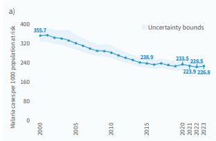 En 2023, le nombre des nouveaux cas de paludisme estimés a atteint 263 millions dans 83 pays à travers le monde, contre 252 millions en 2022 et 226 millions en 2015. Entre 2022 et 2023, l'Éthiopie (+4,5 millions), Madagascar (+2,7 millions), le Pakistan (+1,6 million), le Nigéria (+1,4 million) et la République démocratique du Congo (+600 000) sont les pays qui ont le plus largement contribué à cette hausse. L'incidence du paludisme, qui est liée à la croissance démographique, a augmenté durant la période 2015–2023, passant de 58 à 60,4 cas pour 1 000 habitants exposés au risque de paludisme.