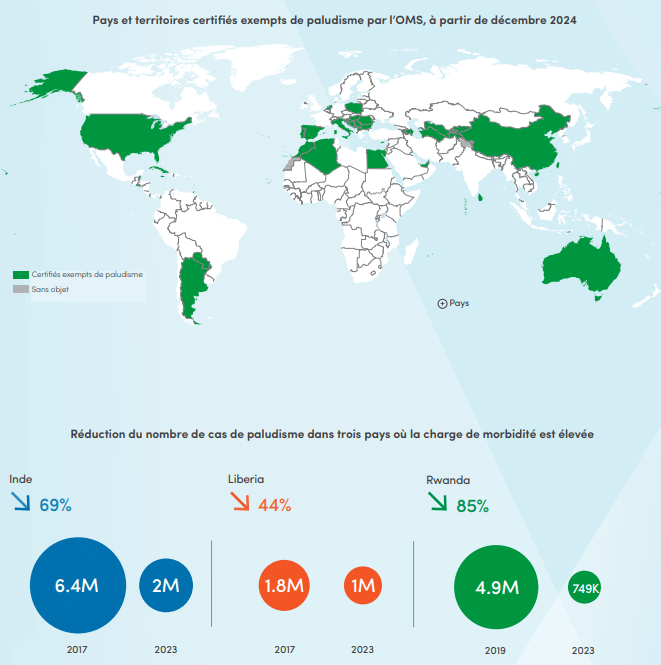 Dans la région Afrique de l'OMS, le Rwanda a réduit de 85 % son nombre de cas de paludisme entre 2019 et 2023, passant de 4,9 millions de cas estimés à 749 000, alors que le Libéria a enregistré une diminution de 44 % de son nombre de cas depuis 2017, soit une baisse de 1,8 million à 1 million. Dans la région Asie du Sud Est, l'Inde a réduit son nombre de cas de 69 %, avec 6,4 millions de cas en 2017 contre 2 millions en 2023. Voir l'infographie