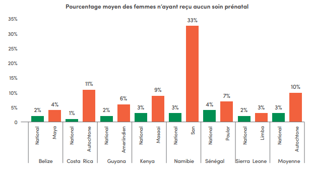Dans le monde entier, les peuples autochtones affichent habituellement des taux d'invalidité et de maladie plus élevés, rencontrent de plus grandes difficultés pour accéder aux services de santé et bénéficient d'une espérance de vie nettement plus courte que tous les autres citoyens de leur pays. Les adolescentes et les femmes autochtones, par exemple, doivent relever de véritables défis pour accéder à des soins prénatals au niveau mondial. Les femmes autochtones sont souvent privées des traitements préventifs du paludisme, ce qui menace davantage encore leur propre santé et celle de leurs enfants. Voir l'infographie
