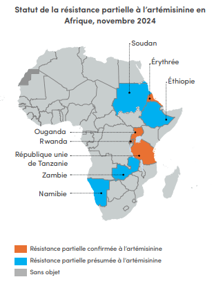 À ce jour, quatre pays d'Afrique de l'Est confirment la présence d'une résistance partielle à l'artémisinine (Érythrée, Ouganda, RépubliqueUnie de Tanzanie et Rwanda). En se basant sur les données disponibles, la même résistance est également suspectée dans quatre autres pays (Éthiopie, Namibie, Soudan et Zambie).