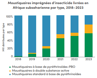 En 2023, ces moustiquaires à l'efficacité renforcée ont représenté 78 % des 195 millions de moustiquaires livrées en Afrique subsaharienne, soit une augmentation considérable par rapport aux 59 % de 2022.