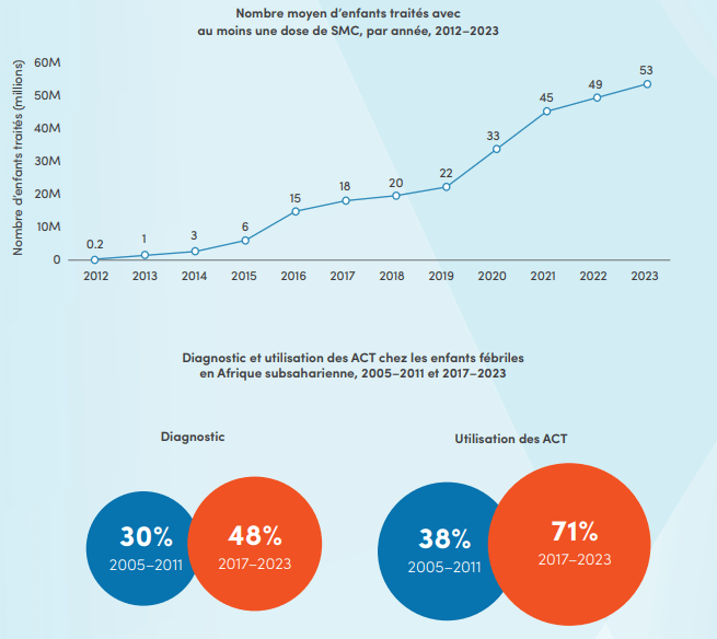 Dans 26 pays d'Afrique subsaharienne, le pourcentage d'enfants avec de la fièvre présentés à un prestataire de santé et pour qui un diagnostic a été établi est passé d'une médiane de 30 % dans les études de référence (de 2005 à 2011) à 48 % dans les enquêtes les plus récentes (de 2017 à 2023). Sur tous les enfants présentés à un prestataire de santé et ayant reçu un médicament antipaludique, une médiane de 71 % a été traitée par ACT de 2017 à 2023, contre 38 % entre 2005 et 2011.